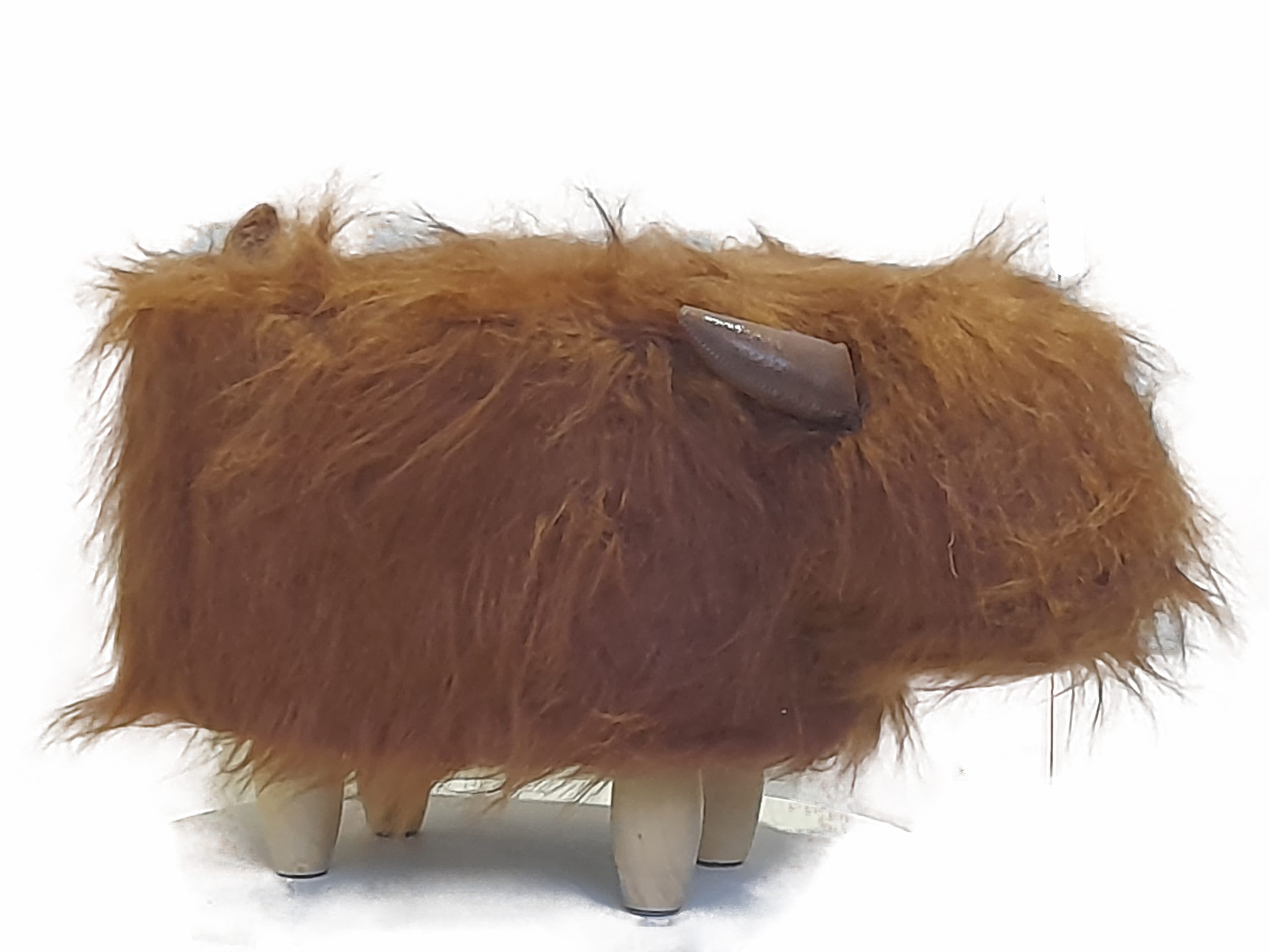 A selection of Synthetic Fur Highland Cow footstools, variation colours include: orange, grey, white, teal, pink and black. Comes with wooden legs.